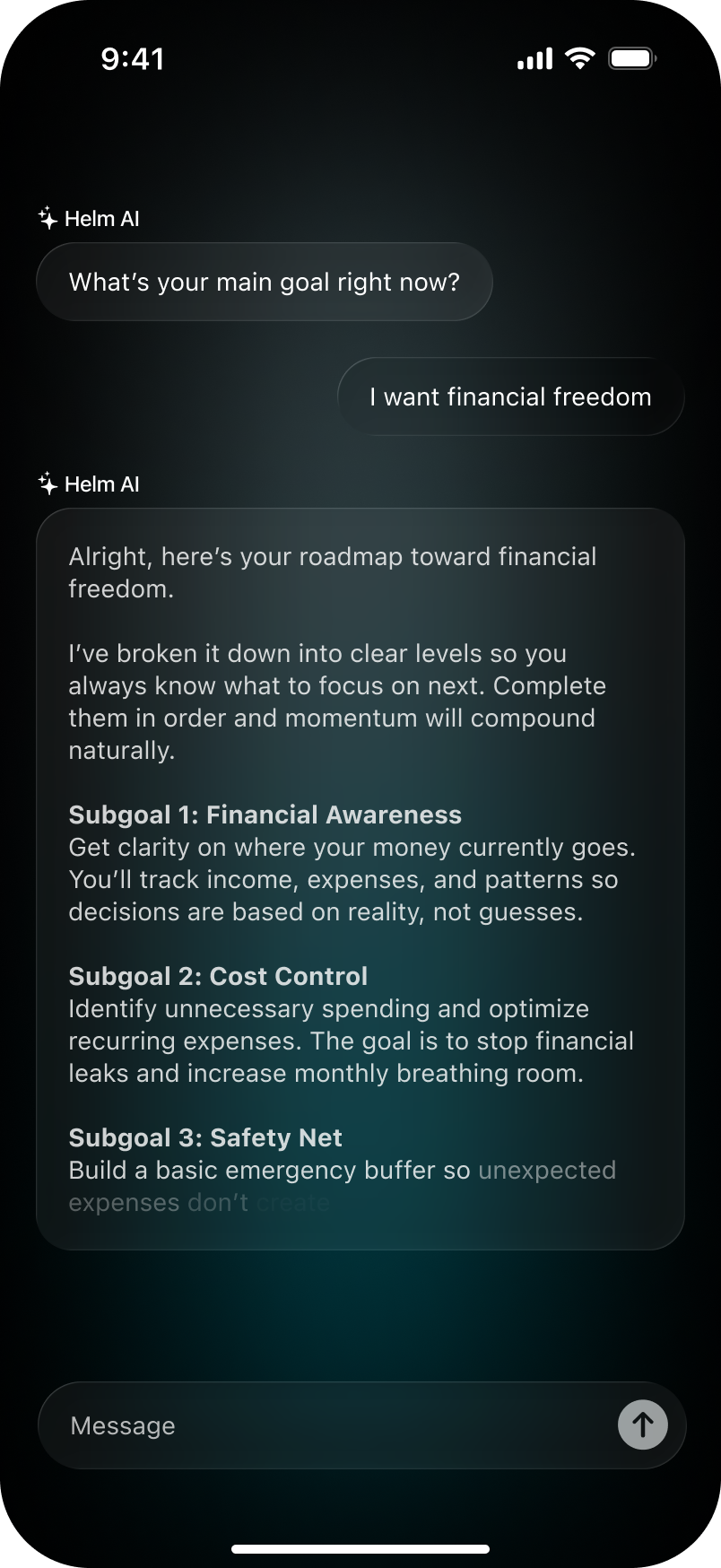 Stop letting big goals overwhelm you. Helm uses AI to break down your ambitions into clear subgoals, daily habits, and actionable tasks, creating a personalized roadmap that turns intention into real, measurable progress.
